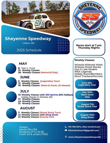 • Ransom County Fair Full Race Schedule: sheyennespeedway.com/schedule Racing Divisions This Week: • IMCA Stock Cars • IMCA SportMods • IMCA Hobby Stocks/Bombers • WISSOTA Midwest Modifieds • INEX Legends • Mini Stocks Times:
